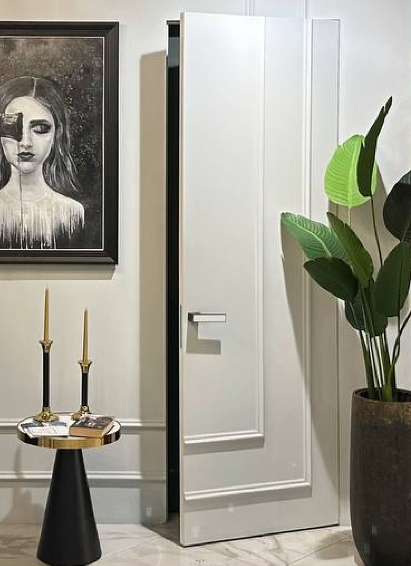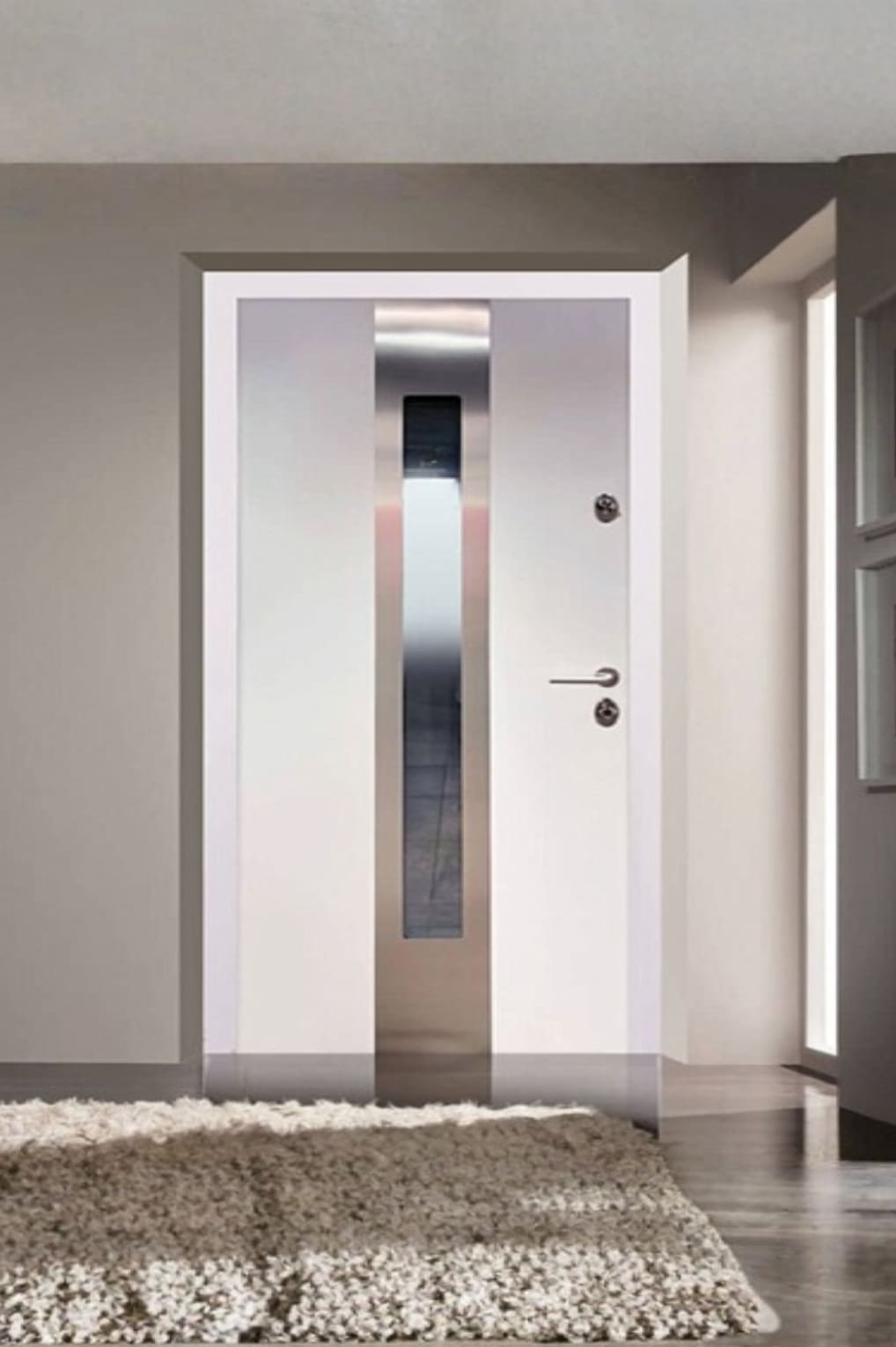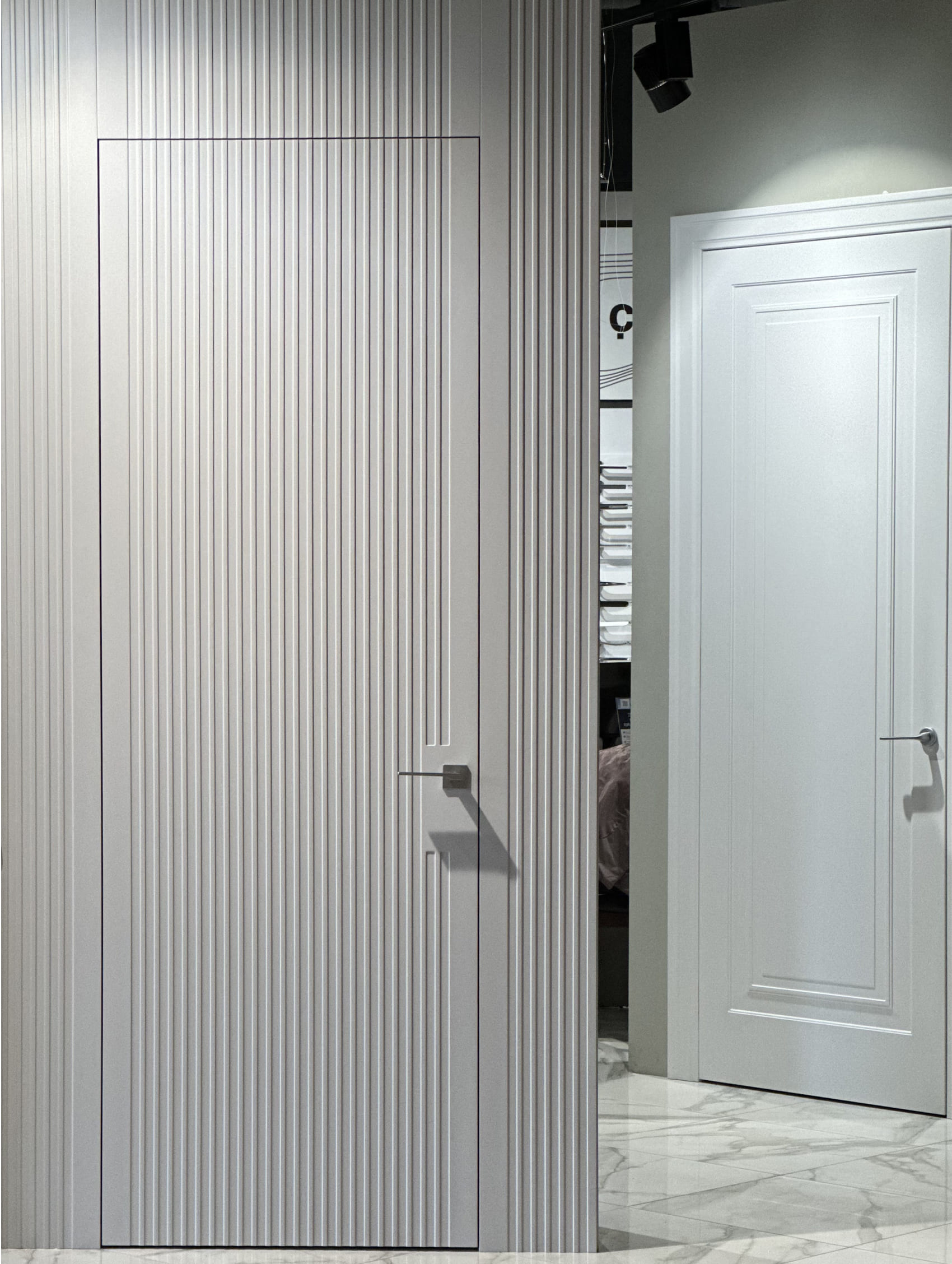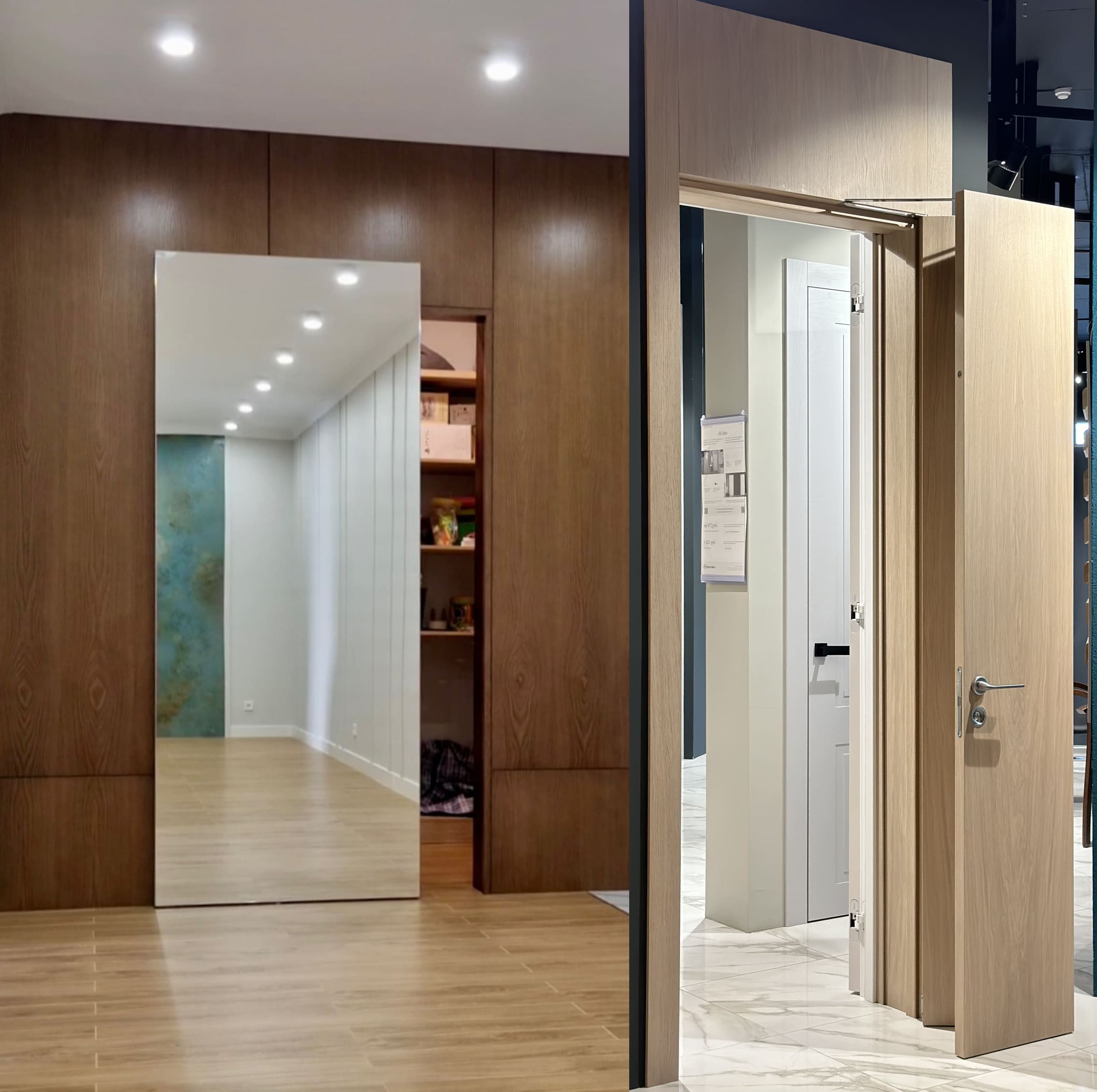 В дверях отсутствуют стандартные петли и наличники с наружной стороны, что делает ее дизайн более аккуратным и стильным.