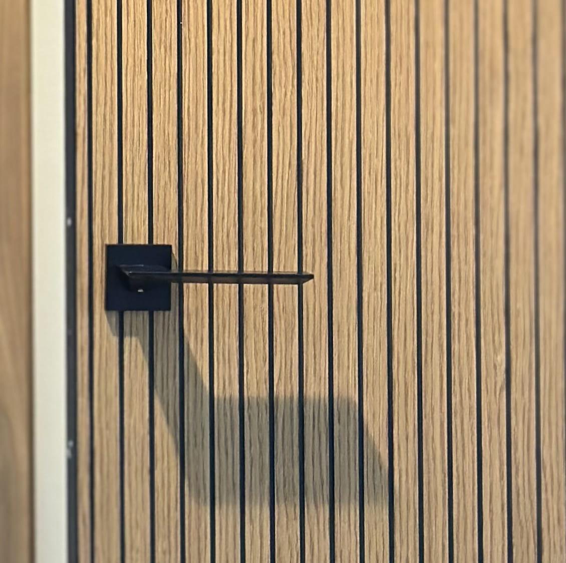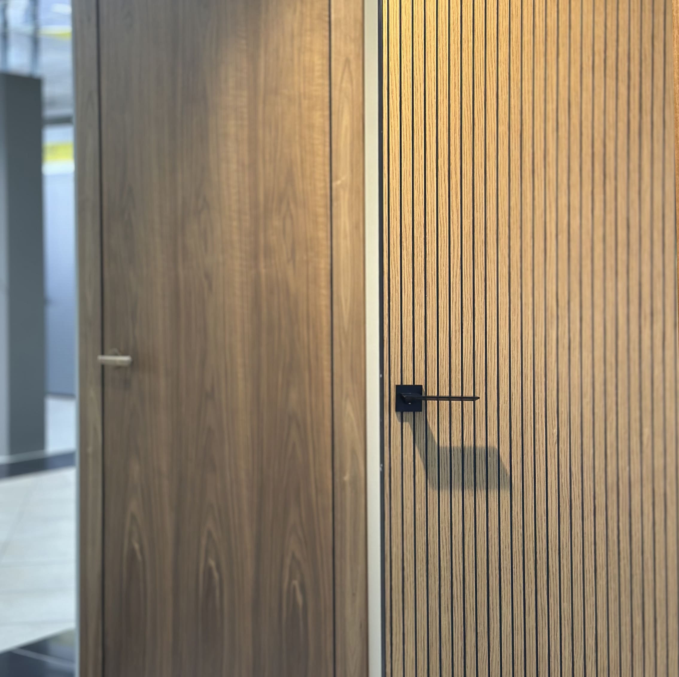Двери коллекции выполнены из натурального шпона с геометричной фрезеровкой. Возможны декоративные делители-молдинги, алюминиевая кромка и прокрас фрезеровки по палитре RAL.