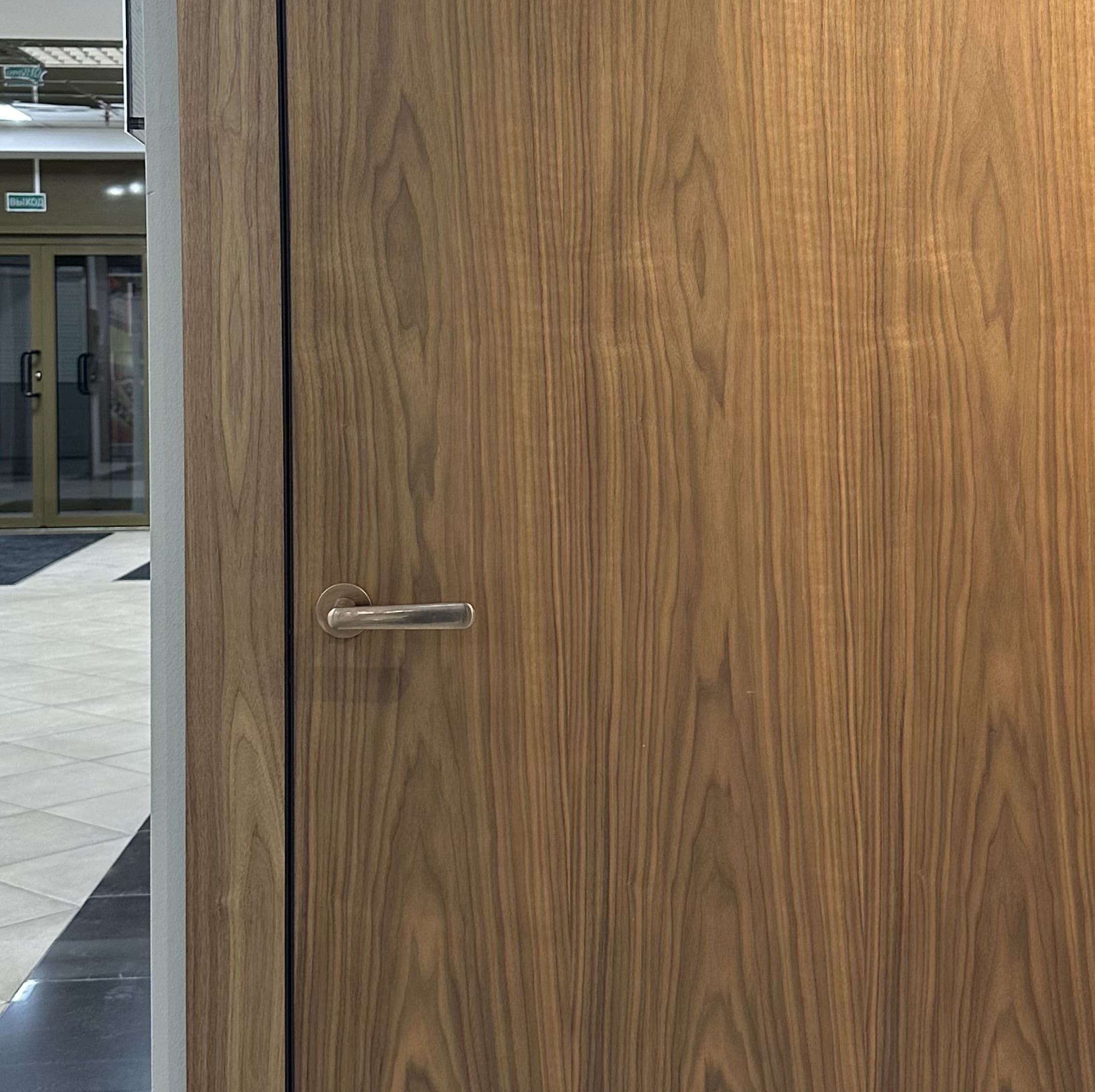 Нестандартное направление шпона выделяет дверь за счёт необычной фактуры. В интерьере это решение работает как декоративный акцент, оживляя пространство.