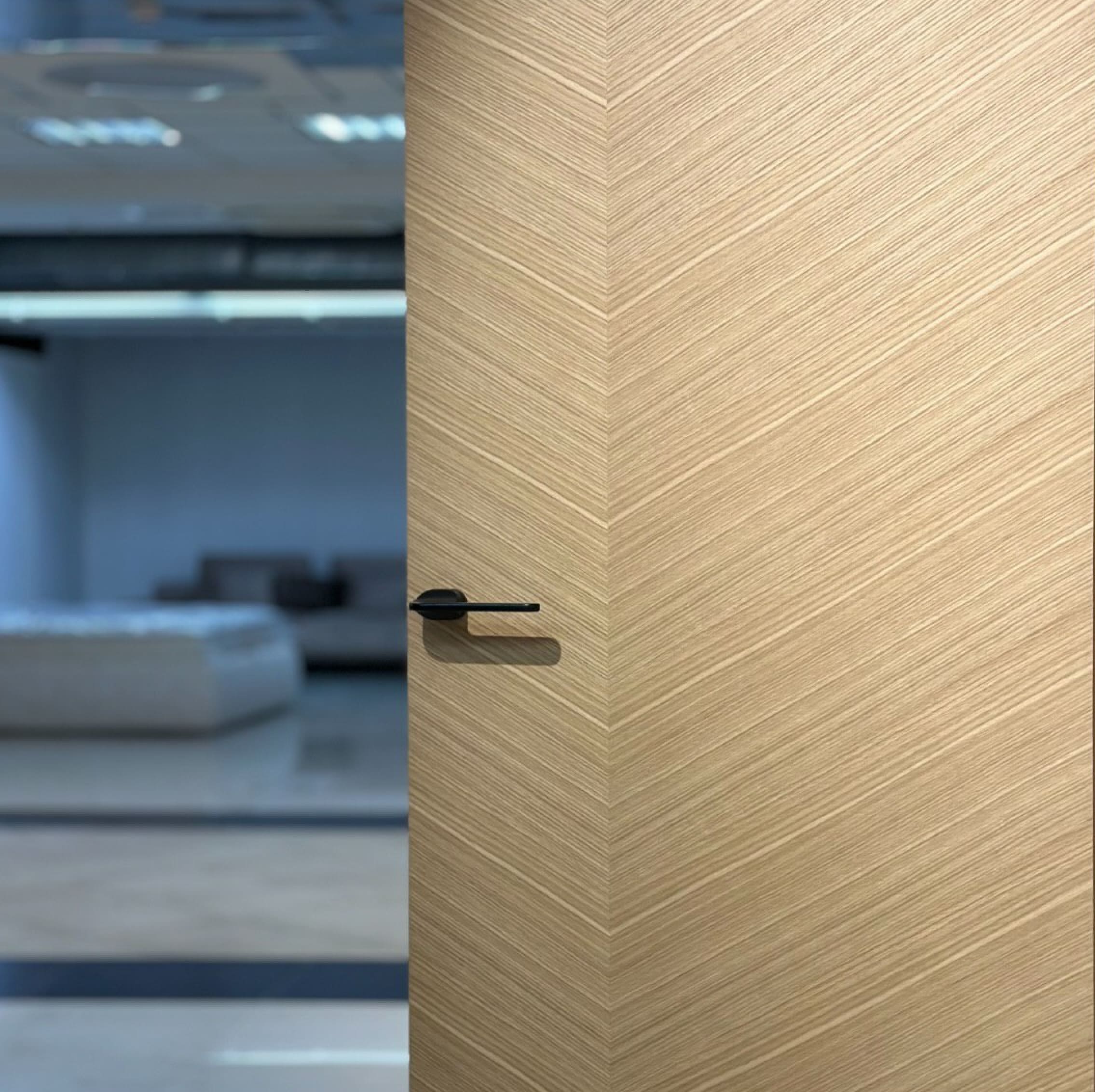 Нестандартное направление шпона выделяет дверь за счёт необычной фактуры. В интерьере это решение работает как декоративный акцент, оживляя пространство.