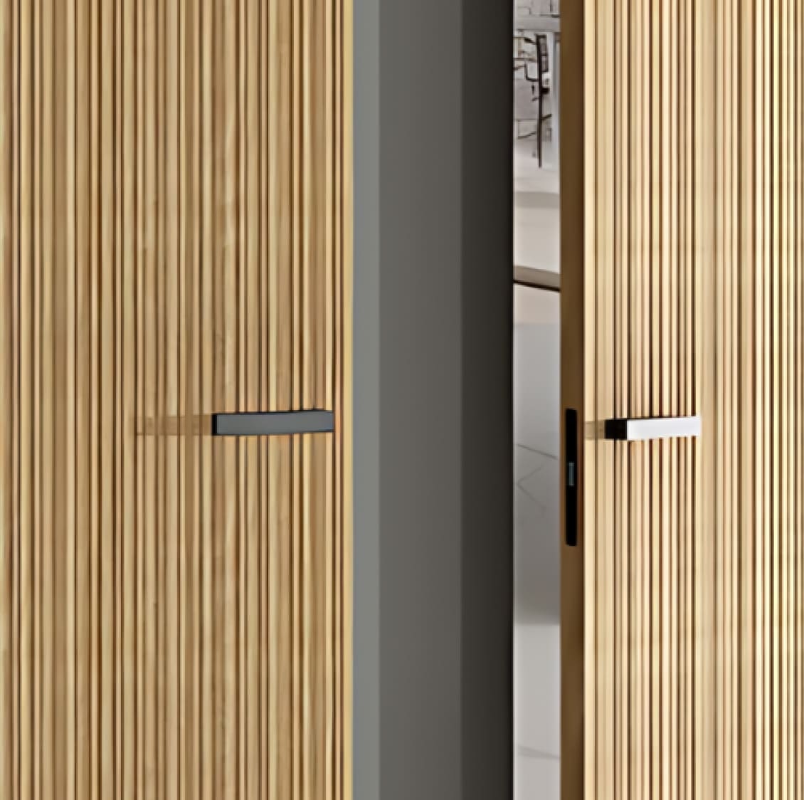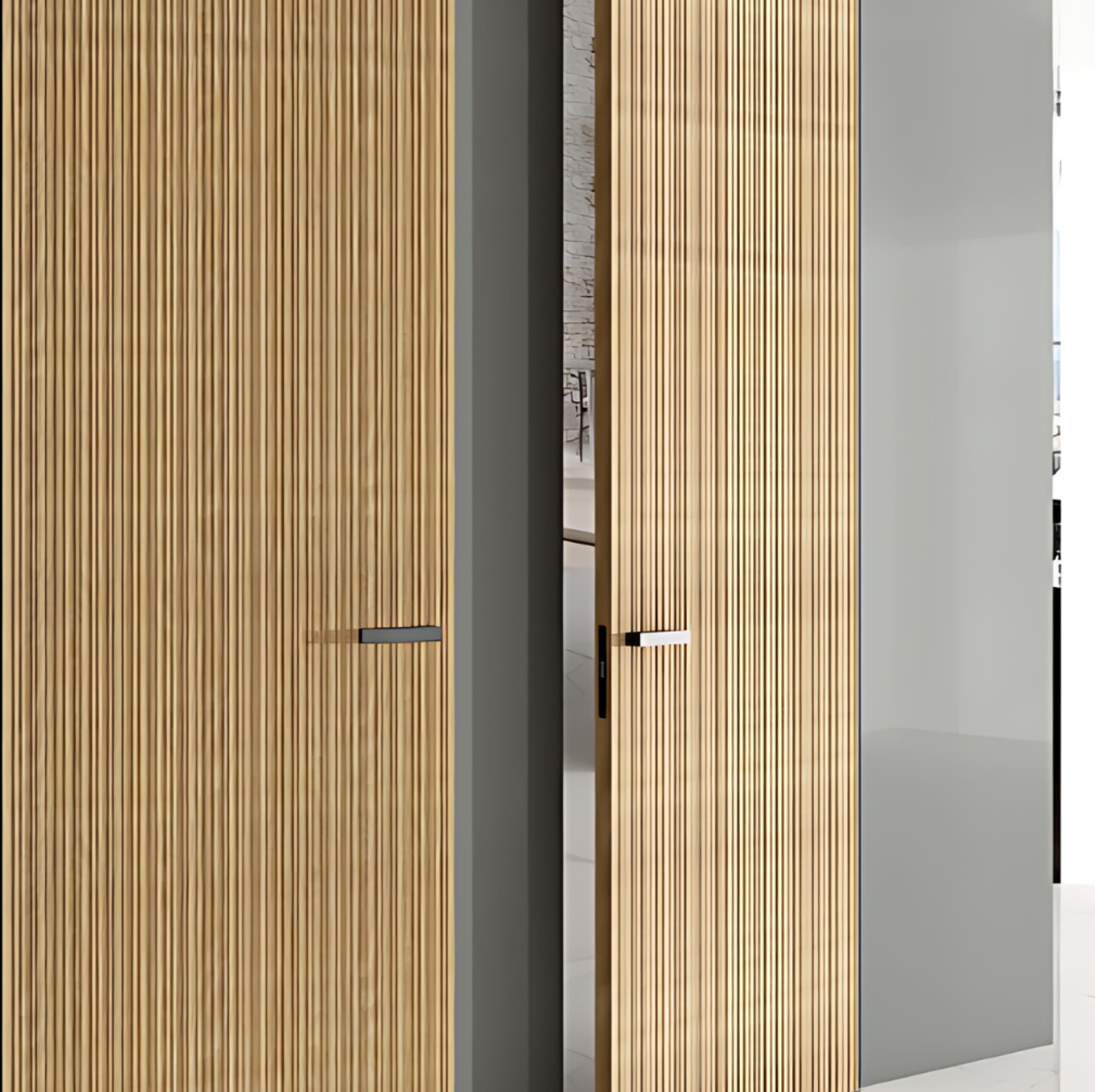 Вертикальная фрезеровка по всей поверхности полотна формирует чёткий ритм линий и выразительный рельеф. Такая отделка подчёркивает высоту и элегантность двери, органично вписываясь в классические и современные интерьеры за счёт изящной геометрии.