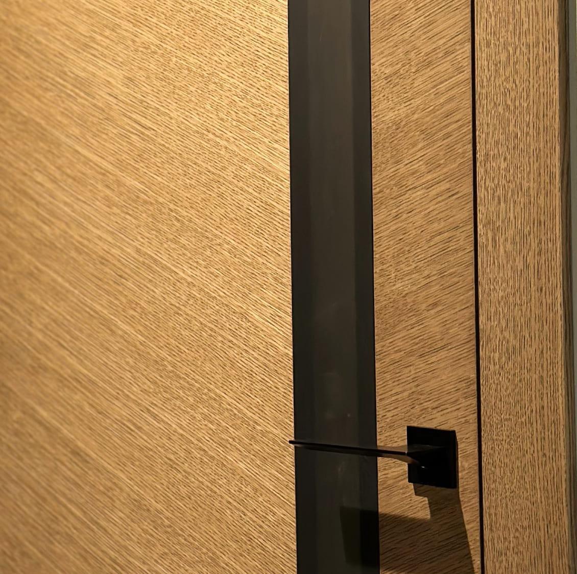 Сочетание шпона и матового стекла объединяет тепло древесной текстуры и лёгкость стекла. Такая отделка подойдёт для уютных современных интерьеров, обогащая их природным рисунком.