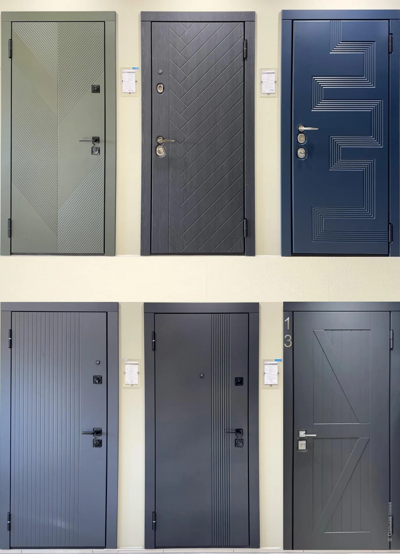 В салоне представлены образцы дверей в популярном дизайне, с комбинированной отделкой, смелыми цветовыми решениями, чёрной фурнитурой, зеркалами, инновационными системами.