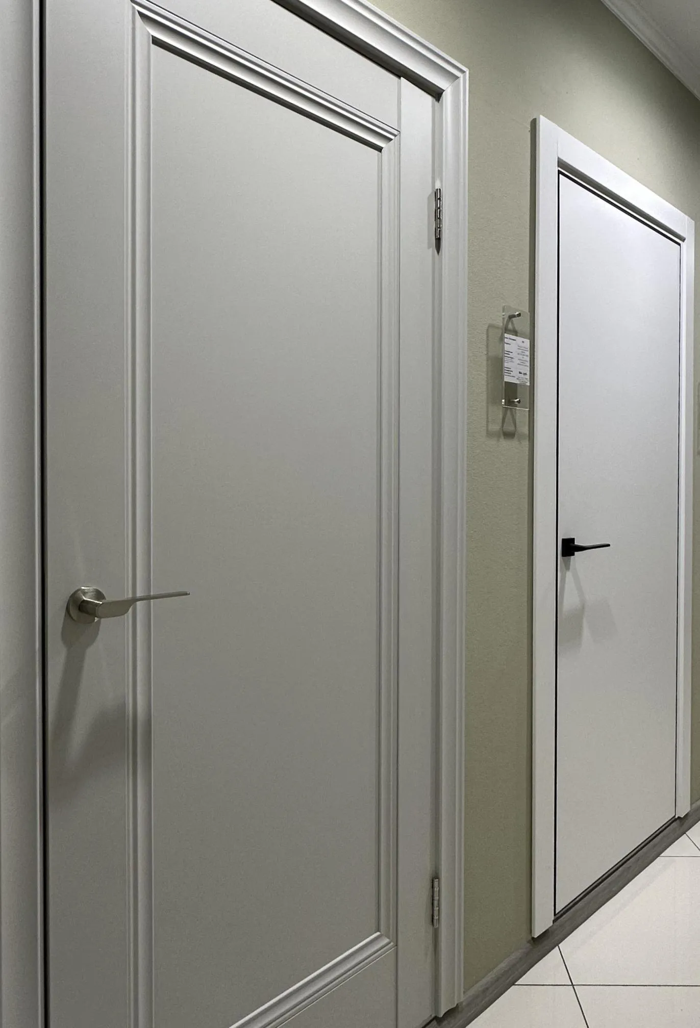 В салоне представлены образцы дверей в популярном дизайне, с комбинированной отделкой, смелыми цветовыми решениями, чёрной фурнитурой, зеркалами, инновационными системами.