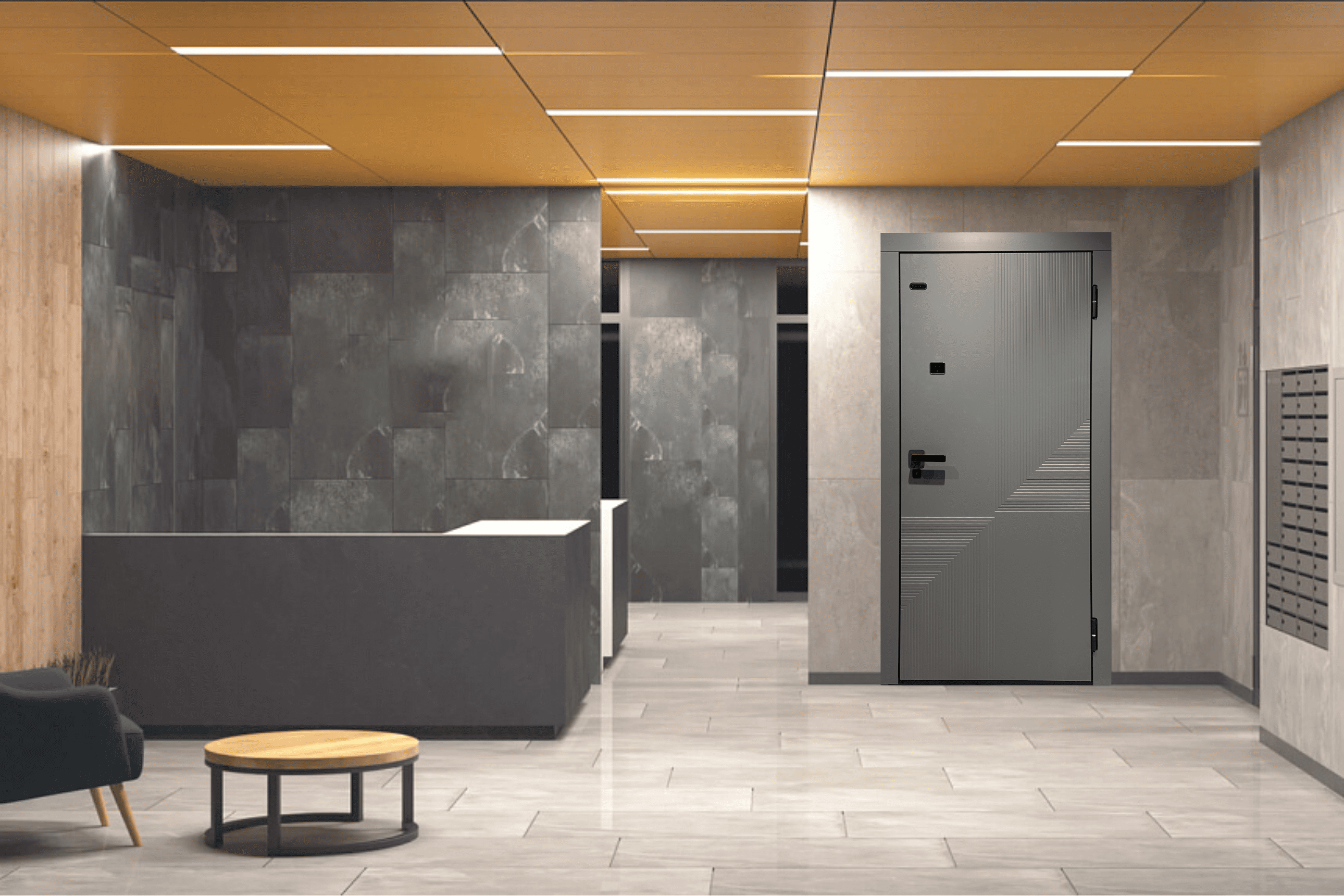 Внешняя отделка двери выполнена в популярном стиле с аккуратной фрезеровкой, которая подчёркивает геометрию полотна и создаёт актуальный образ входной группы, поэтому она гармонично смотрится в разных архитектурных решениях.